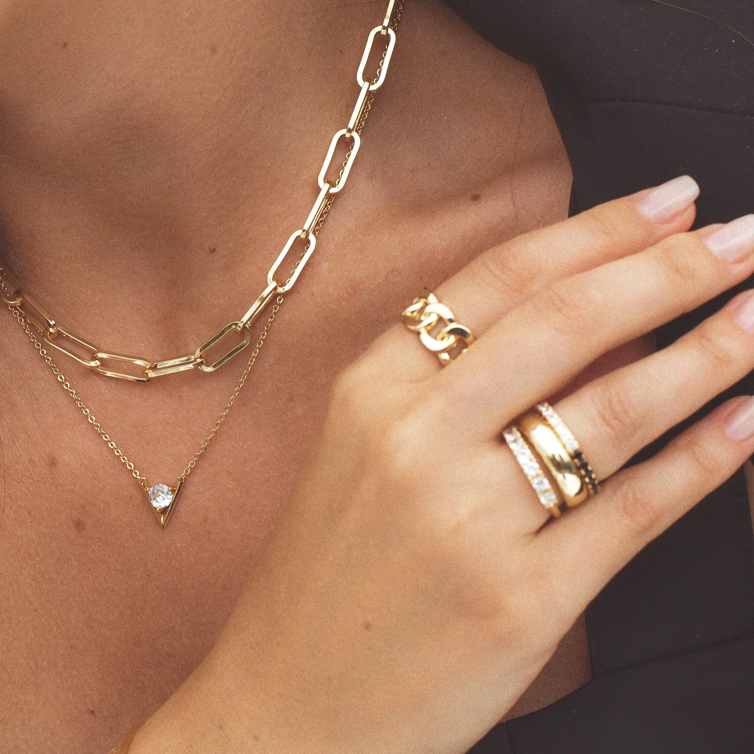 Anel dourado liso placa com cristal redondo e detalhe