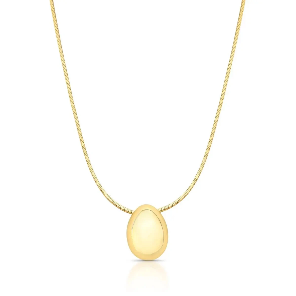 Colar banhado a ouro com pingente liso em formato de gota abaulada, combinando com malha esteira laminada. Elegância discreta para valorizar qualquer visual com sofisticação e delicadeza.