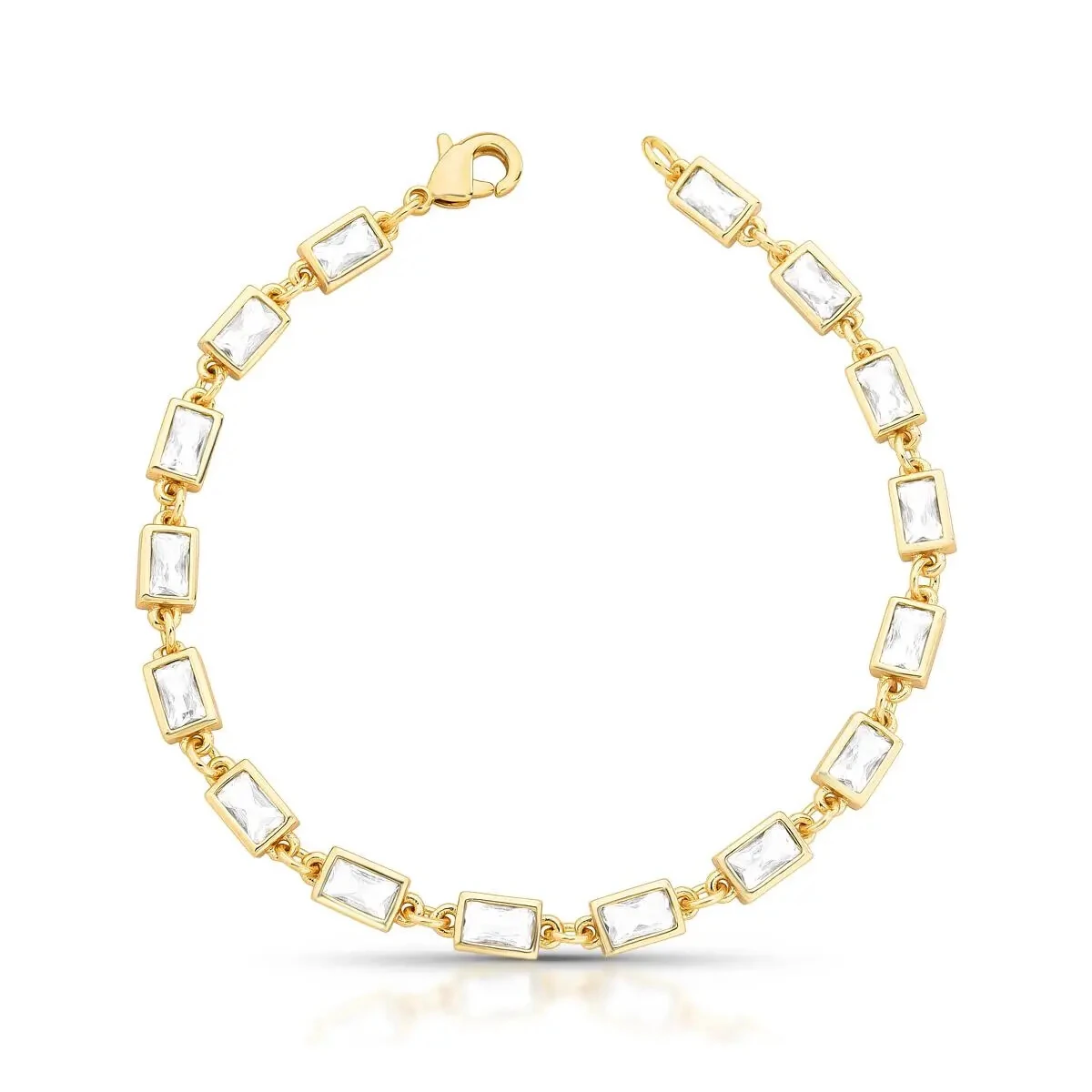 Pulseira banhada a ouro com cristais retangulares intercalados com elos redondos, que proporcionam um visual elegante e sofisticado para complementar seu estilo com delicadeza.