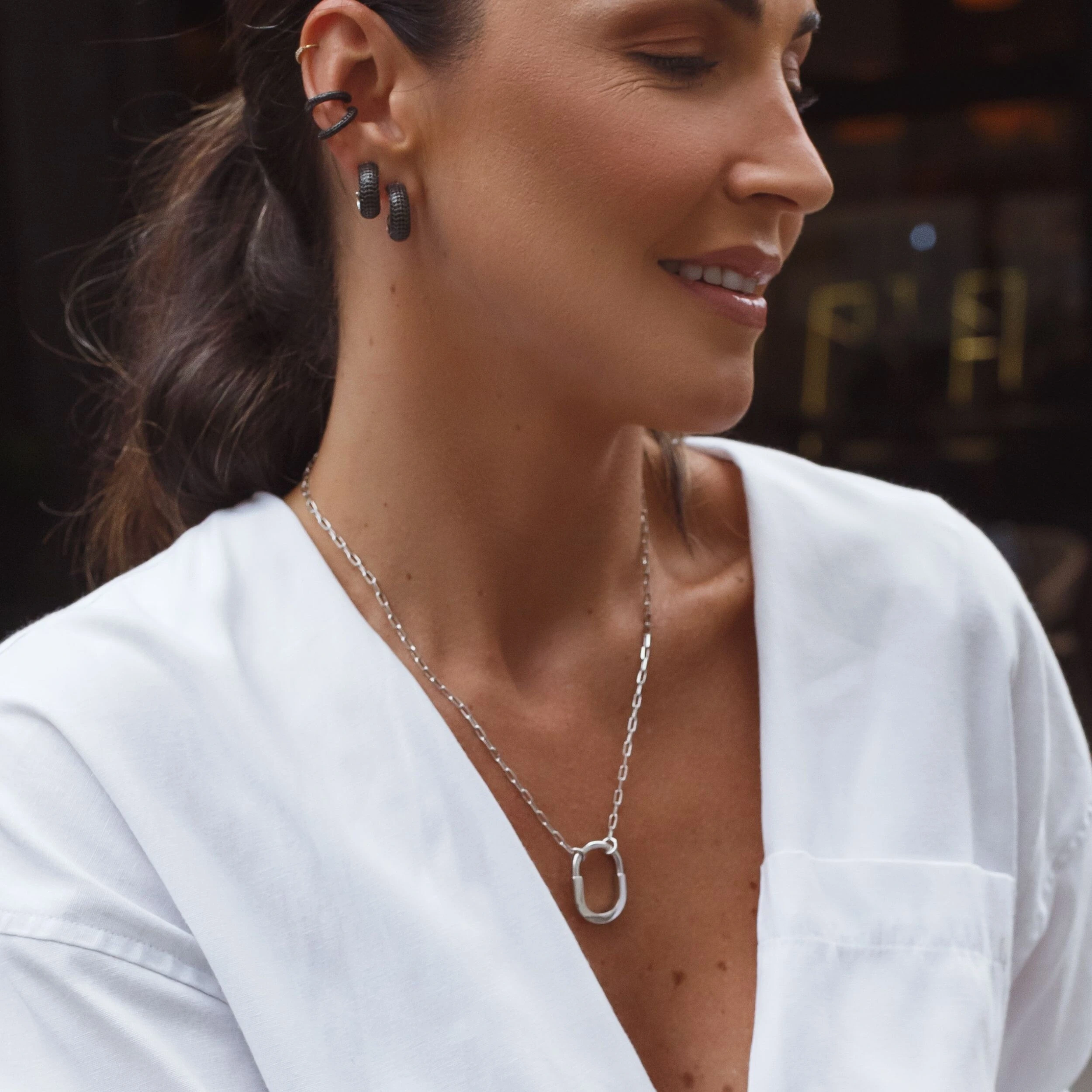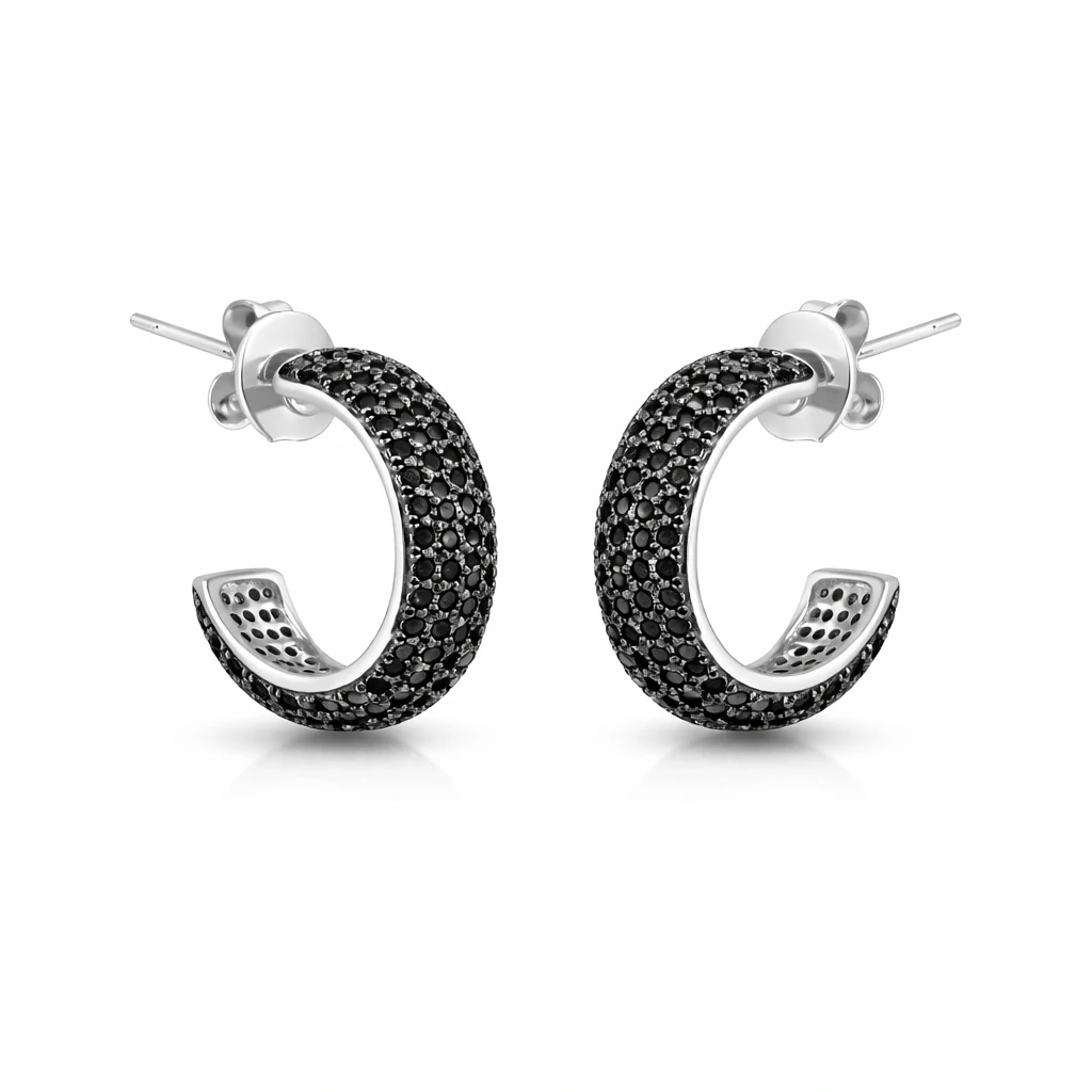 Essa meia argola em banho de ródio é totalmente cravejada com zircônias negras, criando um contraste marcante e sofisticado. O brilho profundo das pedras traz personalidade à peça, enquanto o design clássico da argola garante versatilidade para compor desde produções minimalistas até looks mais elaborados.