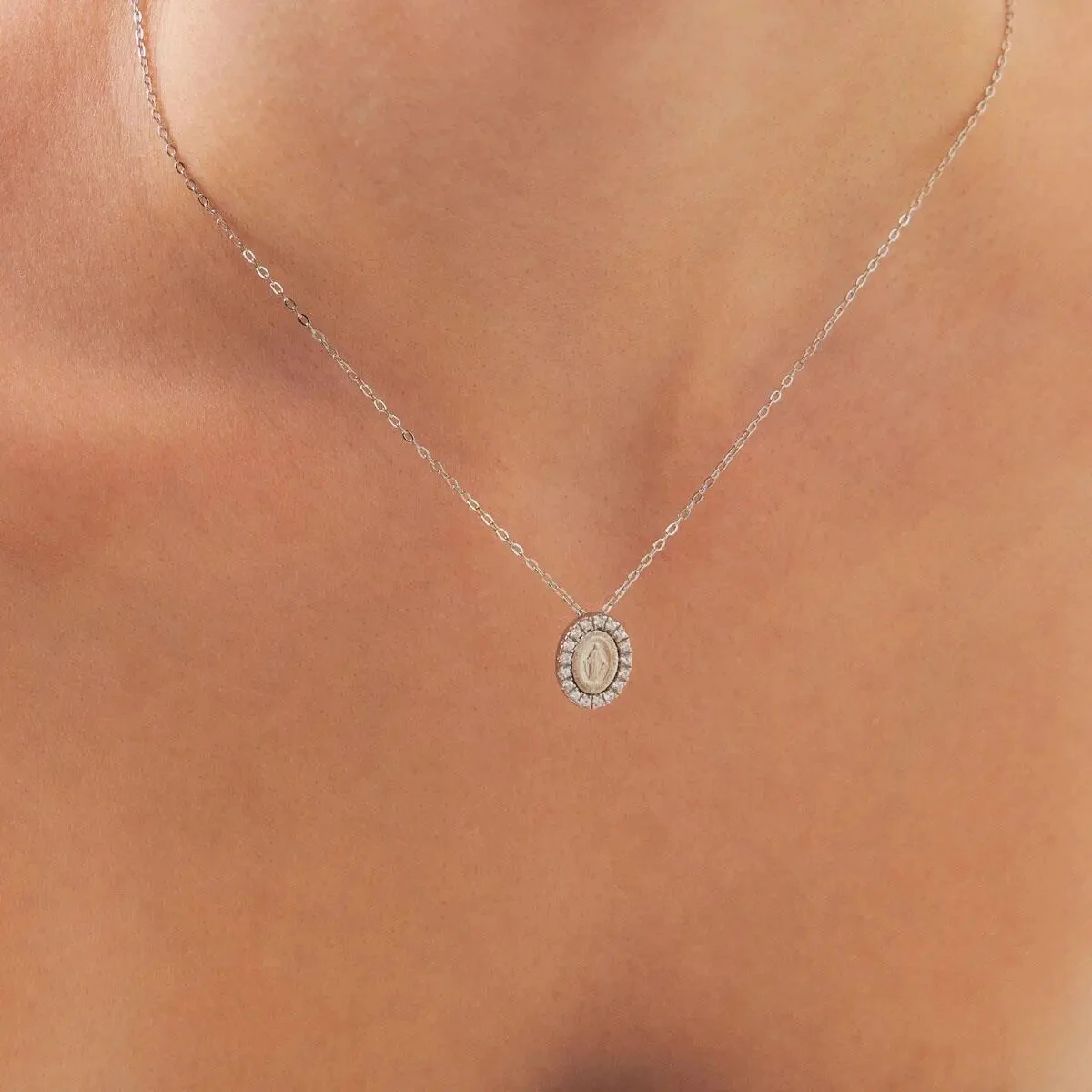 Colar em malha veneziana com pingente oval nossa senhora das graças e zircônias na cor branca prata 925 banho de ródio.