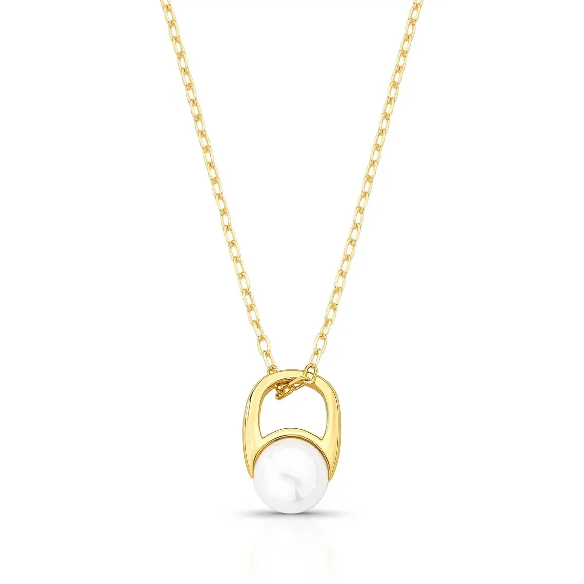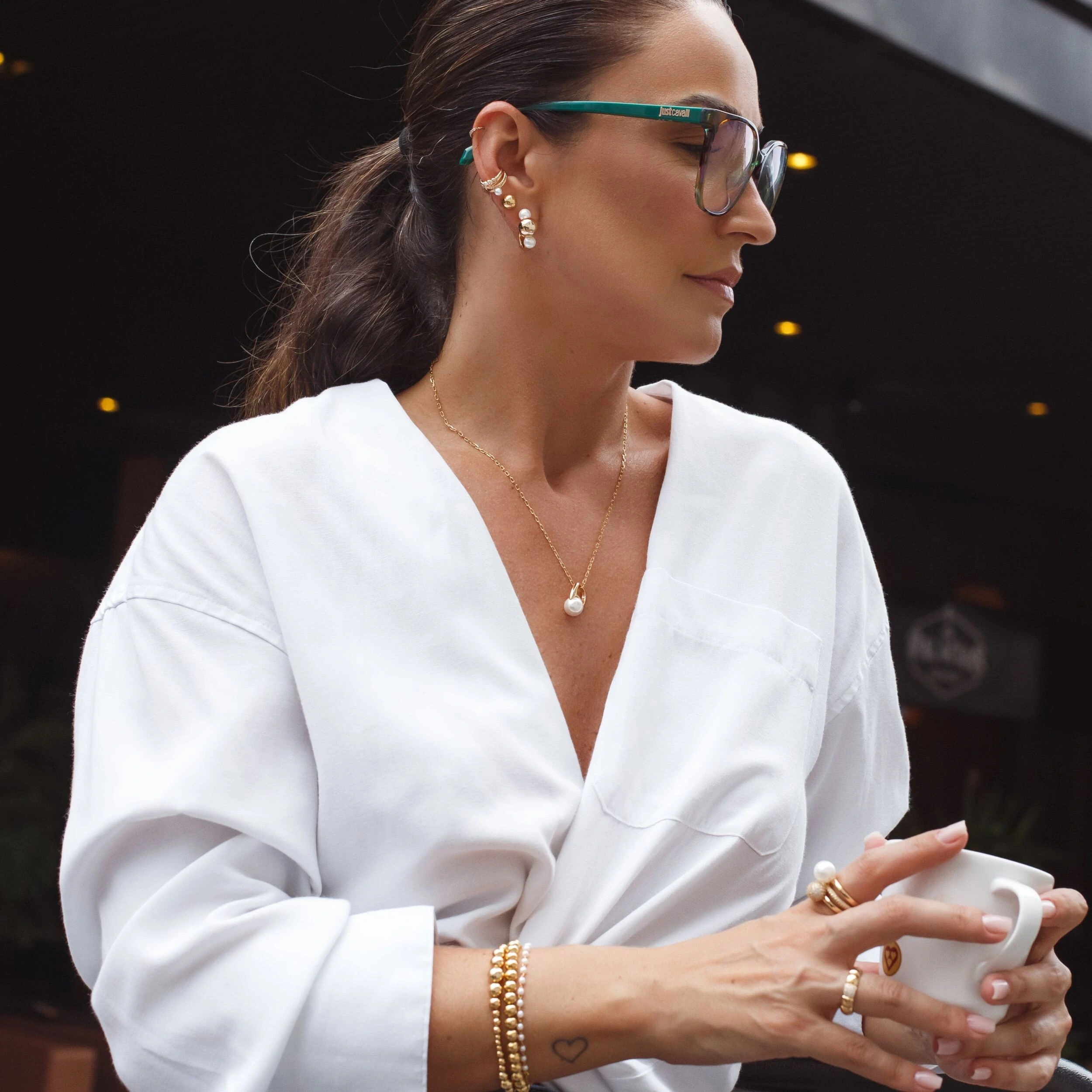 Colar em malha de elos retangulares, com pingente de pérola shell, curvo, vazado, em pêndulo, banhado a ouro. As pérolas também tem significado e simbolismo importante. Representando o símbolo essencial da feminilidade e pureza.