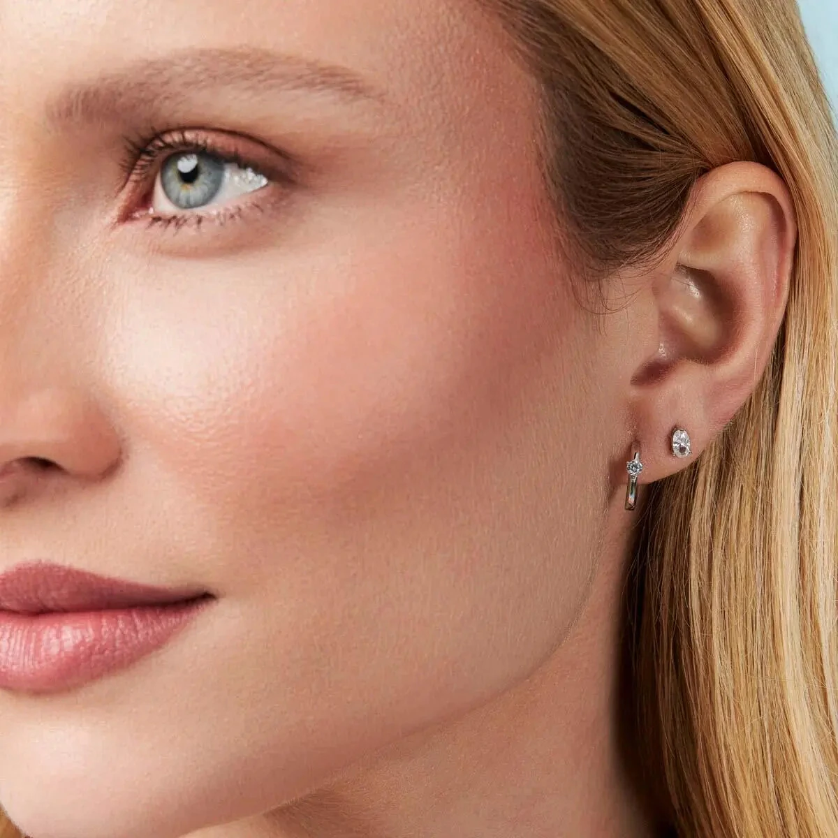 Argola em prata 925 com banho de ródio e cristal redondo. Modelo delicado com fecho click, ideal para quem busca um acessório sofisticado e versátil para o dia a dia.