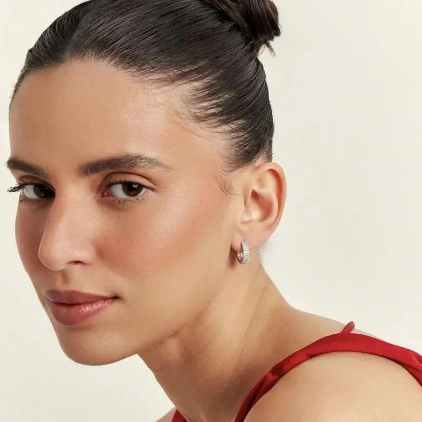Argola com duas fileiras cravejadas de zircônias brancas.