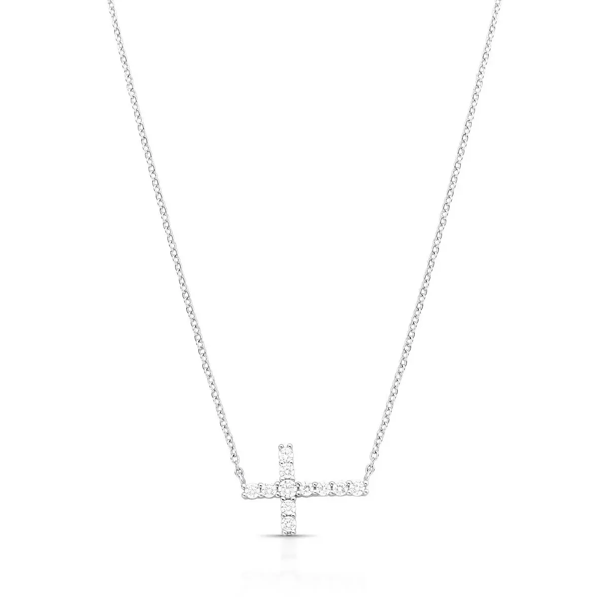 Colar em prata 925 com banho de ródio, possui pingente de cruz em cristais redondos, composto por malha de elos ovais delicados. Peça sofisticada que realça a fé e estilo em qualquer ocasião.