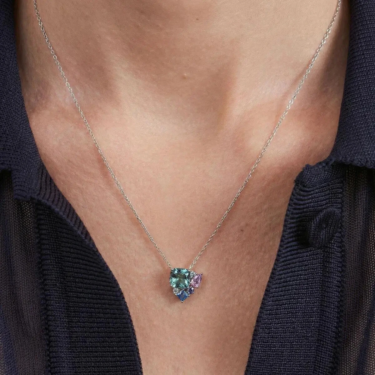 Colar em prata 925 com banho de ródio, contendo pingente em cristais nos formatos gota, quadrado e zircônias, com detalhes laterais vazados. A malha de elos ovais confere delicadeza e modernidade à peça, perfeita para complementar looks elegantes com brilho sutil.