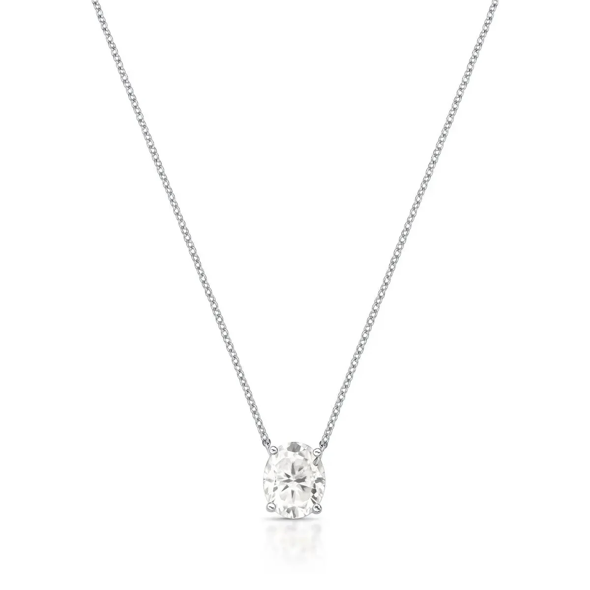 Colar em Prata 925 com deslumbrante moissanite oval de 8x10mm e 3 quilates, finalizado com banho de ródio branco que intensifica o brilho e garante maior durabilidade à peça. A moissanite é uma gema sintética de altíssima qualidade, com dureza de 9,25 na escala de Mohs, oferecendo excelente resistência ao risco e brilho superior.