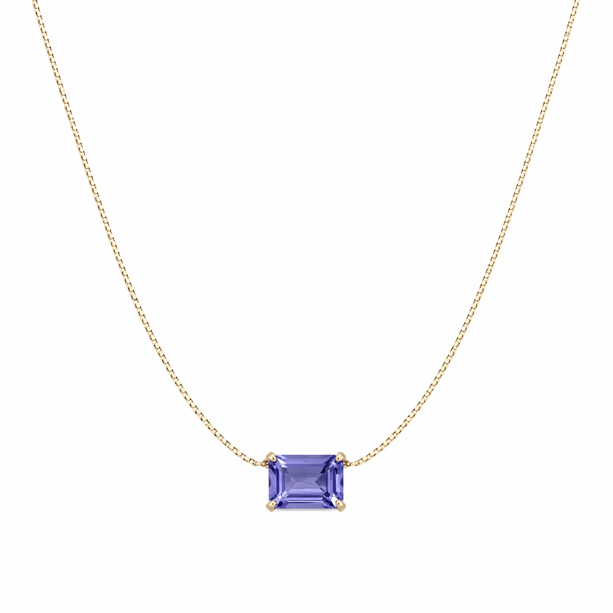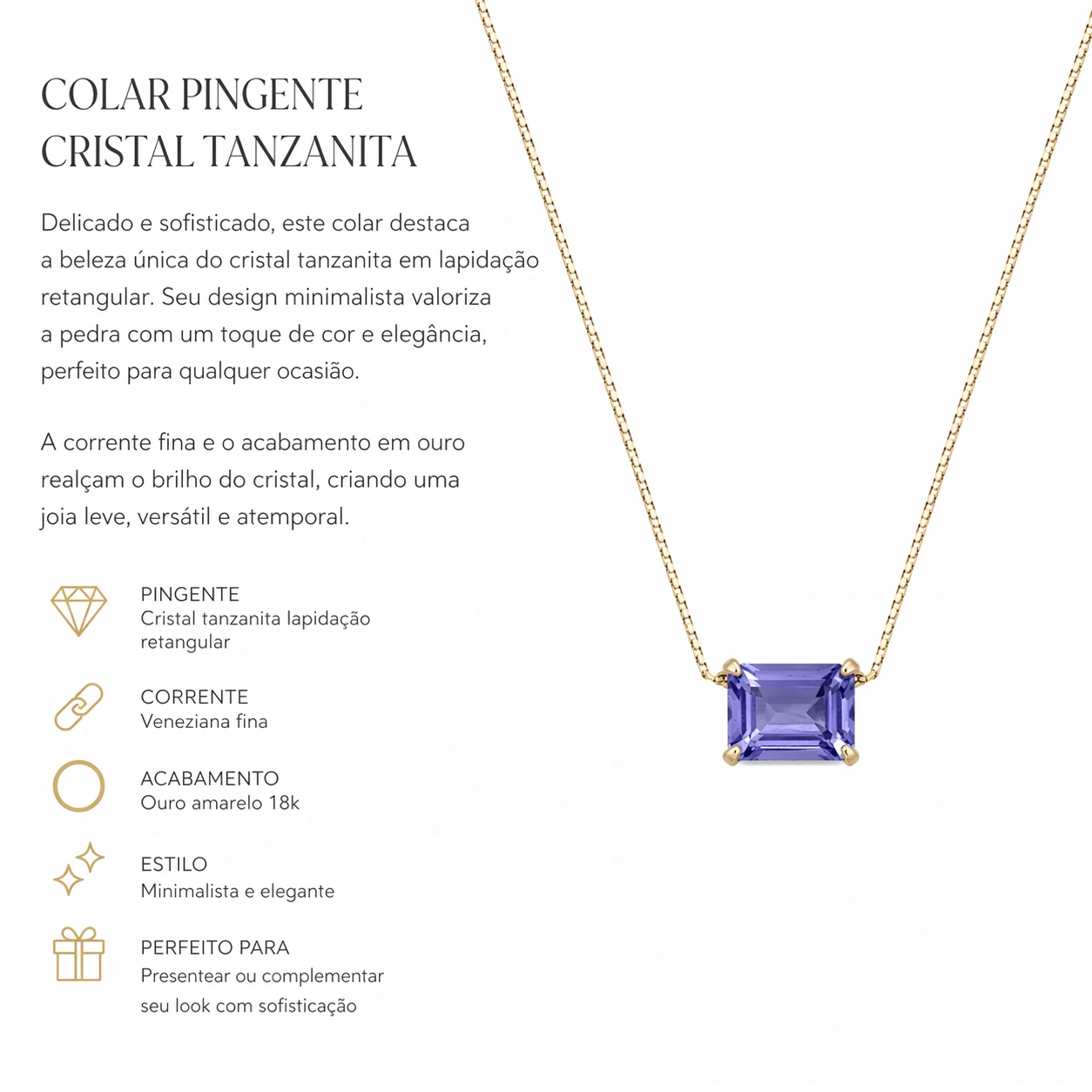 Colar com pingente retangular em cristal na cor tanzanita, que traz um tom intenso e elegante, inspirado nas gemas mais desejadas da alta joalheria. Sua lapidação alongada valoriza o brilho e cria um efeito sofisticado no colo.
